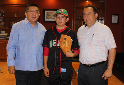 El joven beisbolista Kevin Geovanny García Sotelo, recientemente galardonado con el Premio Estatal del Deporte, fue recibido la mañana de este lunes por el Secretario de Educación, Cultura y Deporte, Pablo Espinoza Flores, quien en reconocimiento a su talento deportivo le entregó una manopla profesional y le expresó que desde Gobierno del Estado se seguirá apoyando a su fructífera carrera.